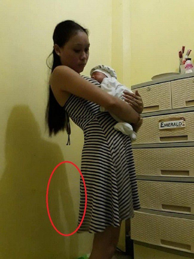 Coba perhatikan foto di atas, bayangannya terlihat seperti sedang bungkuk dengan salah satu tangannya terjatuh di sisi tubuhnya. Padahal Arlaine terlihat sedang berdiri tegak dengan posisi kedua tangannya sedang memegang bayinya.