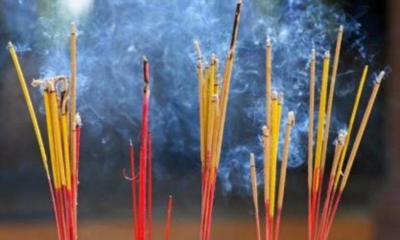 Sesampainya di ruangan, bau dupa menyeruak dan ada sesajen dengan bunga segar di pojokan.