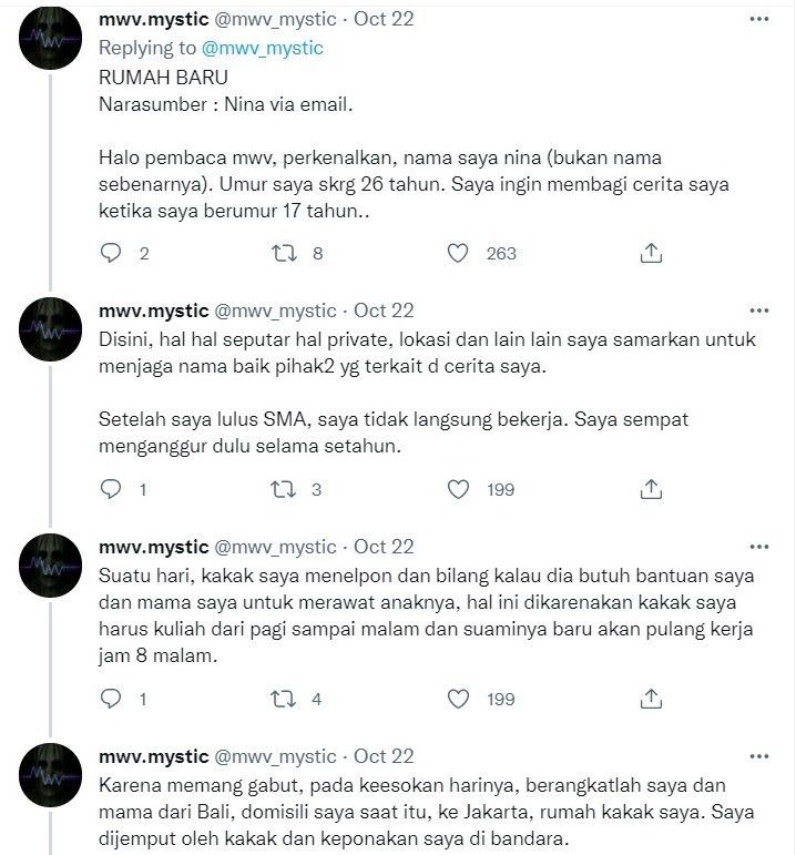 Semua kejadian itu akhirnya terjawab melalui obrolan dari para tetangga pada satu akhir pekan. Ternyata, tetangga mereka juga sudah tahu soal insiden horor di perumahan mereka itu.