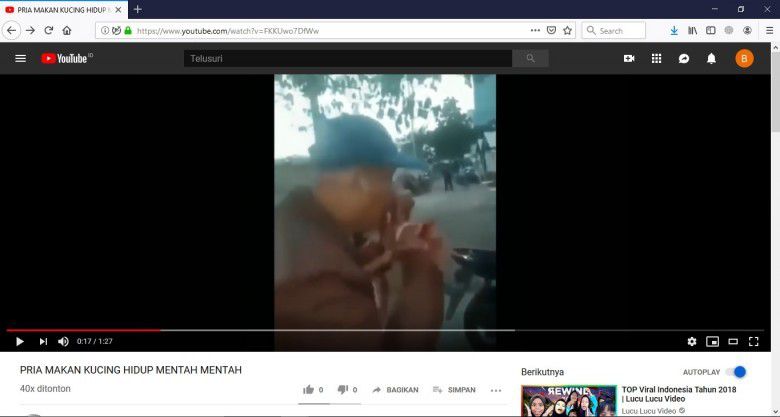 Baru-baru ini dunia maya di Indonesia dihebohkan dengan video seorang pria paruh baya yang memakan seekor kucing. Parahnya kucing yang ia makan itu masih hidup. Ditambah lagi ia melakukan tindakan tersebut di tengah jalan perkampungan yang merupakan ruang publik.