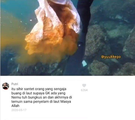 “Itu sihir santet orang yang sengaja buang di laut supaya GK ada yang nemu tuh bungkus an dan akhirnya di temuin sama penyelam di laut,” ujar salah seorang netizen.