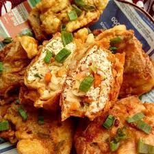Jika sudah, matikan kompor. Lubangi satu sisi bagian tahu. Masukkan isian ke dalam tahu.