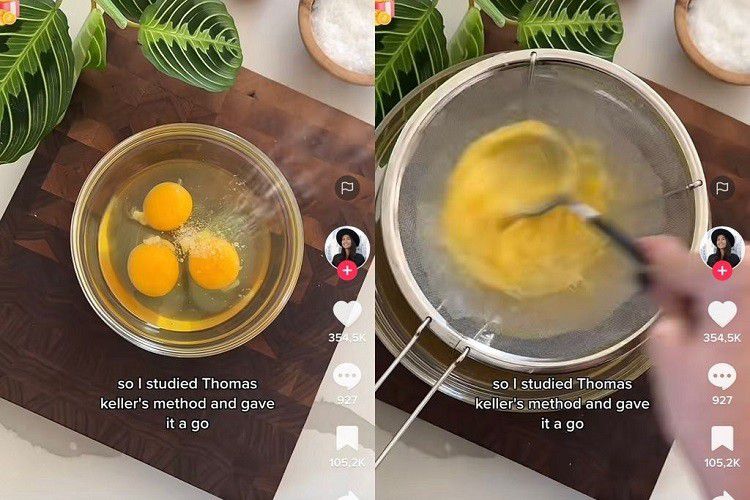 Setelah dihaluskan menggunakan blender dan kocokan kawat, Chef Thomas kemudian menyarankan untuk menyaring telur tersebut. Hal ini agar tekstur telur benar-benar halus. Seorang konten kreator di TikTok dengan akun @maxiskitchen, sudah membuktikannya.