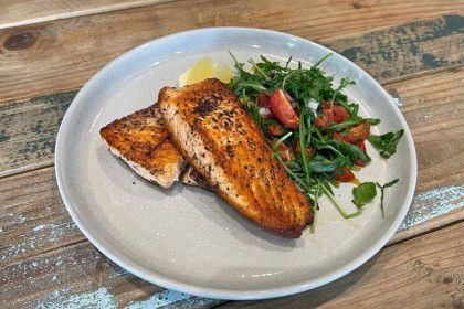 Salmon bisa diolah dalam berbagai cara, salah satunya adalah dengan cara dipanggang. Panggang filet salmon di atas penggorengan anti l-engket dengan campuran rempah seperti paprika, lada hitam, dan rosemary.