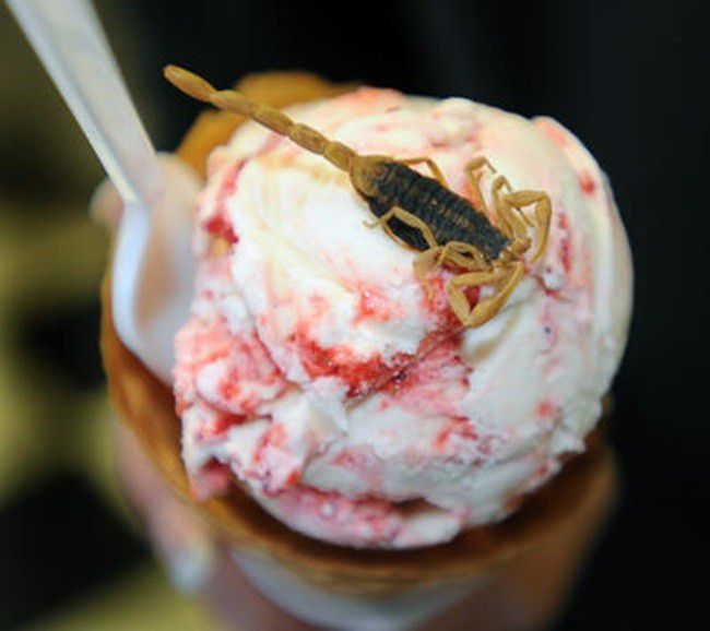 Selain itu, es krim itu juga diberi lumuran saus pedas dan ditambah satu ekor kalajengking utuh sebagai pemanisnya. Es krim ini menimbulkan rasa pedas yang membakar lidah. Jadi bagaimana, apa kalian tertarik untuk coba salah satu makanan dengan topping kalajengking di atas?