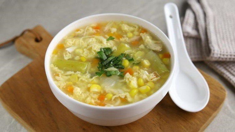 Rebus jagung manis, wortel serta ayam dengan kuah kaldu. Tambahkan garam, merica dan kaldu bubuk.