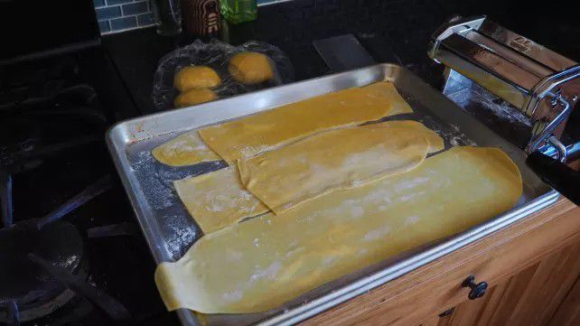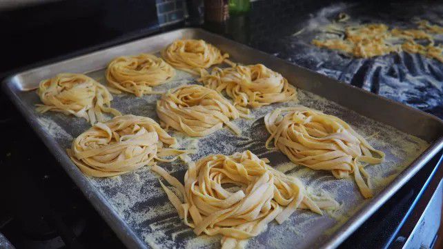 9. Potong adonan pipih dengan cetakan mie. Taburi mie dengan sedikit tepung terigu. Biarkan mie kering selama 30 menit.