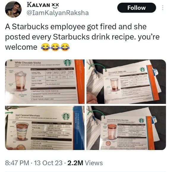 Bahkan cara pembuatannya kurang dari lima tahapan dalam setiap resepnya. Sehingga, resep-resep itu sangat mudah untuk ditiru banyak orang. Total, mantan pegawai yang tak diketahui identitasnya itu sudah membocorkan lebih dari 40 resep minuman ke media sosial.