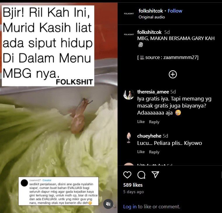 Akun milik remaja siswa sekolah itu merekam menu MBG yang cukup lengkap, seperti ada nasi, lauk daging, buah dan sayuran. Walau begitu, pemandangan seketiika sedikit menjadi ngeri saat sang pengunggah video memperlihatkan adanya seekor siput di samping sayuran daun tersebut.
