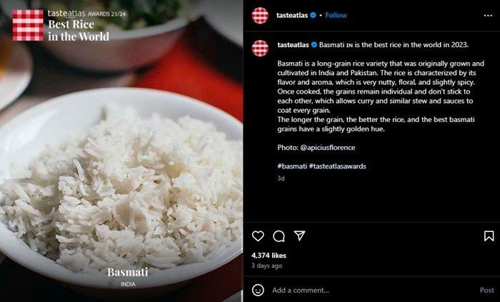 TasteAtlas Nobatkan Basmati Sebagai Beras Terbaik Dunia (Instagram)