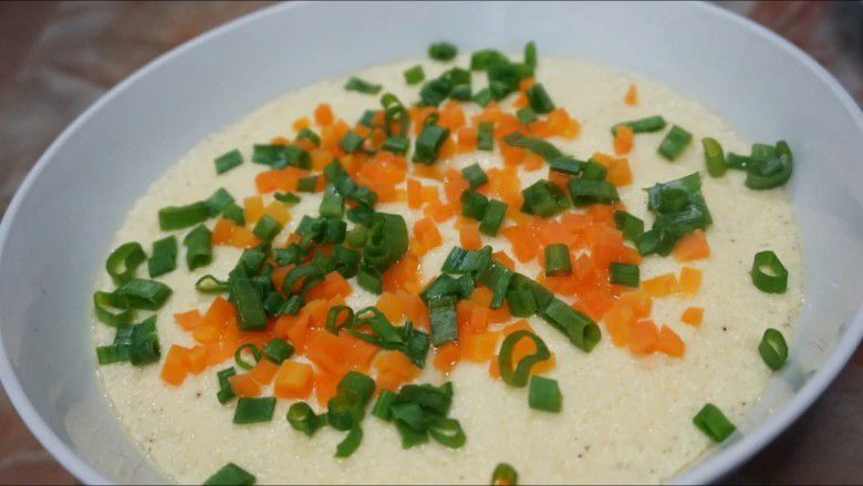 2. Masukkan telur, wortel, daun bawang, cabai rawit, daun jeruk, garam, merica, dan santan. Aduk semua sampai rata.