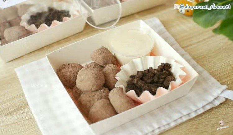 Mochi pun siap disajikan. Untuk jualan, kamu perlu menyajikan mochi di dalam wadah kertas lalu masukkan saus keju ke dalam wadah saus lalu tambahkan topping oreo. Mochi bites pun siap disantap. Selamat mencoba!