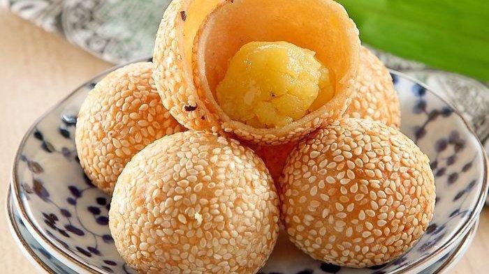 6. Kemudian beri isian dan bulatkan. Kemudian, gulingkan adonan ke dalam wijen hingga seluruh permukaan adonan tertutup biji wijen.