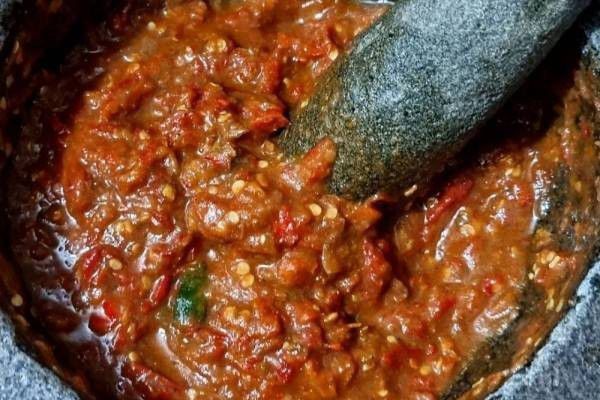Letakkan semua bahan yang sudah digoreng tadi di dalam ulekan. Tambahkan terasi yang sudah dibakar, lalu ulek semua bahan itu hingga halus. Bumbui dengan garam dan gula merah secukupnya. Ulek kembali sampai merata.