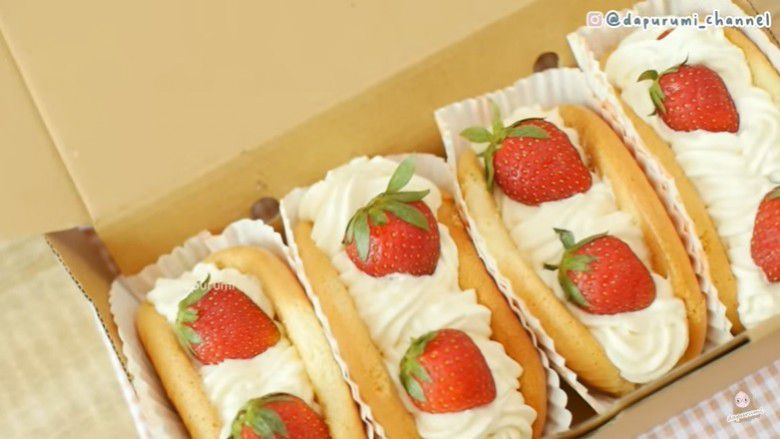 Ambil cup bulat lalu letakkan cake di atas cup. Tekuk cake dan beri secukupnya cream di atasnya sesuai selera. Kemudian beri strawberry. Tutup lagi dengan cream dan beri topping buah strawberry. Jika sudah, strawberry hug roll cake pun siap dinikmati.