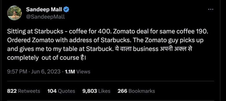 "Sopir Zomato mengambil pesanan saya dan langsung mengantarnya ke meja tempat saya duduk di Starbucks," ucapnya.