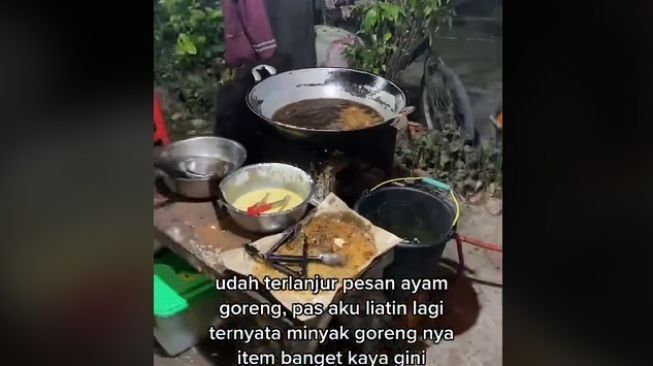 Viral aksi seorang pria yang kaget saat lihat wujud minyak goreng yang dipakai oleh penjual ayam goreng (via tiktok.com)