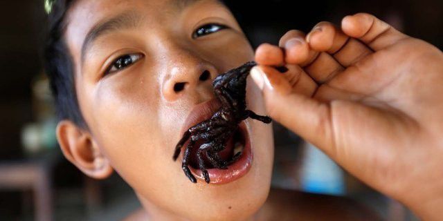 Tarantula goreng akan siap disantap hanya dalam beberapa menit. Mereka tidak punya darah, dan masyarakat mengaku seperti menggoreng udang atau lobster.