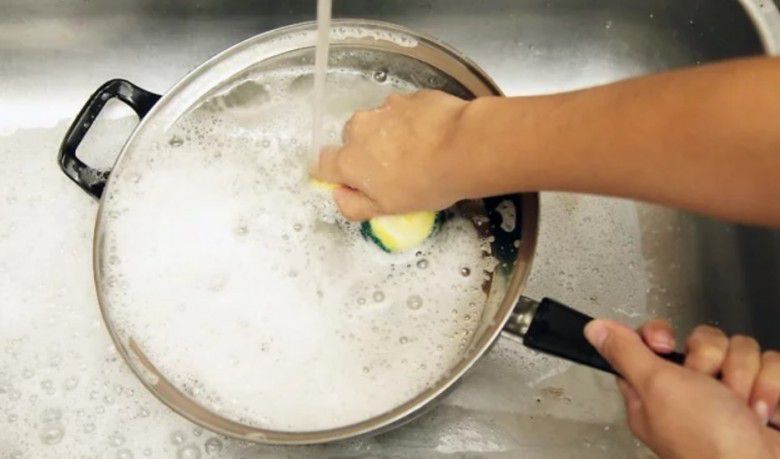 Mencuci wajan stainless steel dengan sabun (wikihow.com)
