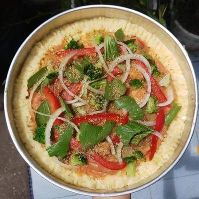 6. Oleskan saus tomat sebagai dasarnya. Kemudian susun semua topping yang sudah kamu persiapkan.