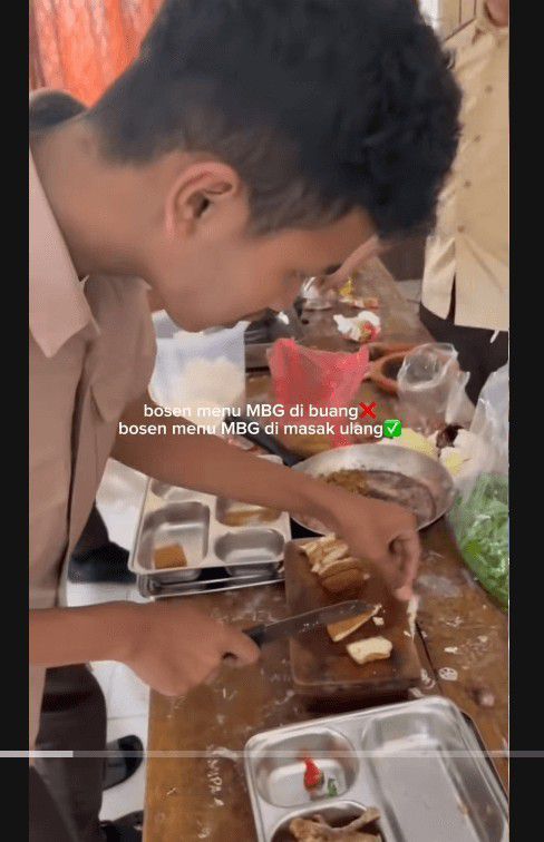 Sementara itu, sekumpulan siswa laki-laki memilih mengkreasikan ulang nasi dan lauk MBG. Ayamnya mereka suwir, lauk lain dipotong-potong, kemudian semuanya dimasak kembali jadi nasi goreng versi kompak. “Yang penting habis,” tulis akun @catalyststhree, sambil menjelaskan kalau kegiatan itu bertepatan dengan praktik memasak di kelas.