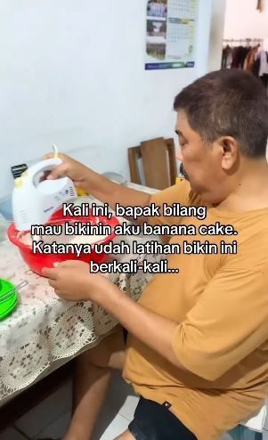"Kali ini bapak bilang mau bikinin aku banana cake. Katanya udah latihan bikin ini berkali-kali dan sekarang udah punya resep terbaik menurut beliau," tulis keterangan Yusfa dalam videonya.