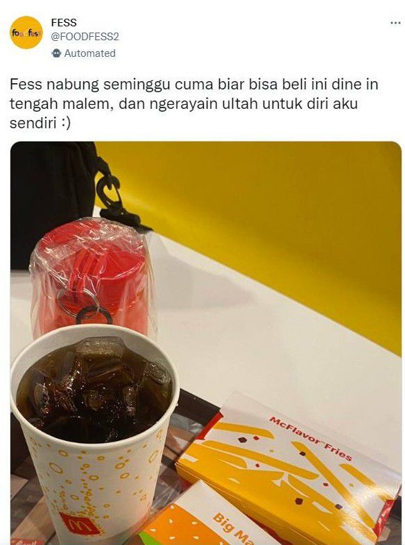 Unggahan Twitter akun @FOODFESS2 menunjukkan pengalaman seorang warganet yang tak diketahui namanya itu, sedang mengunggah foto junk food dari uang tabungannya.