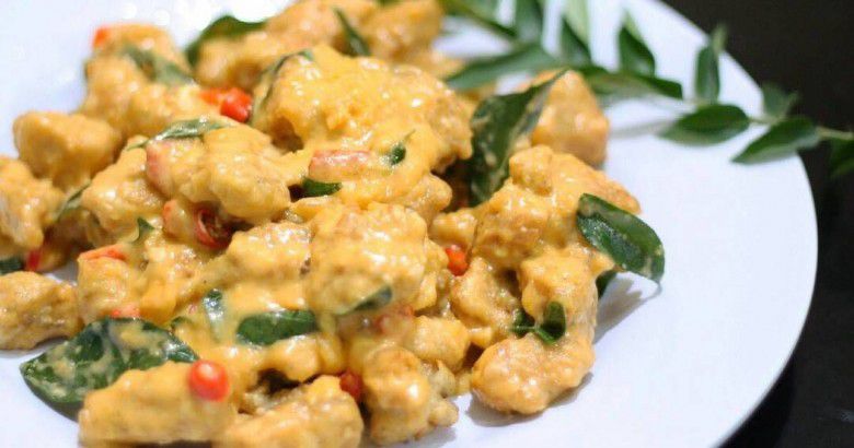 5. Buat yang terakhir, siapin ayam dadu tepung goreng di piring. Lalu, tuang saus salted egg yang udah matang tadi di atas ayam. Ayam Salted Egg siap disantap!