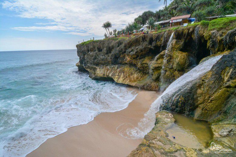Kalau berkunjung ke Pacitan kamu wajib mengunjungi Pantai Banyu Tibo yang berarti air jatuh. Seperti namanya, Banyu Tibo tidak hanya memiliki pantai yang indah, tetapi di sana juga terdapat air terjun yang langsung mengarah ke kawasan Pantai Banyu Tibo. Kalau berkunjung ke sini, kamu wajib berhati-hati ya, terutama buat kamu yang membawa serta si kecil. Sebab, ombak di pantai ini terkenal tinggi.