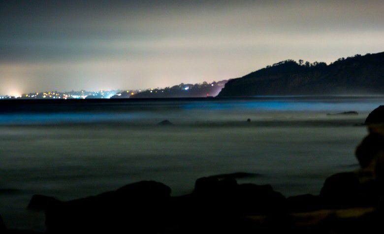 Saat malam, kita biasanya hanya mendengar suara deburan ombak di pantai karena gelap. Namun, kita bisa melihat deburan ombak dalam kondisi gelap di pantai Torrey Pines, San Diego, California, Amerika Serikat (AS).