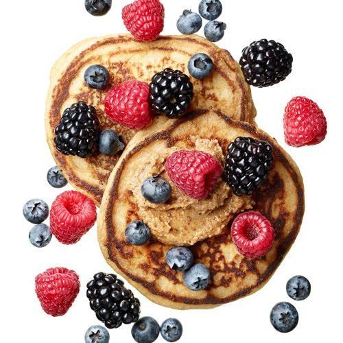 Pilih bahan pancake dari tepung gandum. Panaskan wajan dan buat pancake sebanyak 2 lembar. Saat sudah masak, angkat dan oleskan dengan 1 sendok makan almond butter. Taburkan buah berry, kamu bisa pilih antara blackberry, blueberry, atau raspberry. Resep istimewa sarapan pagi ini mengandung 333 kalori.