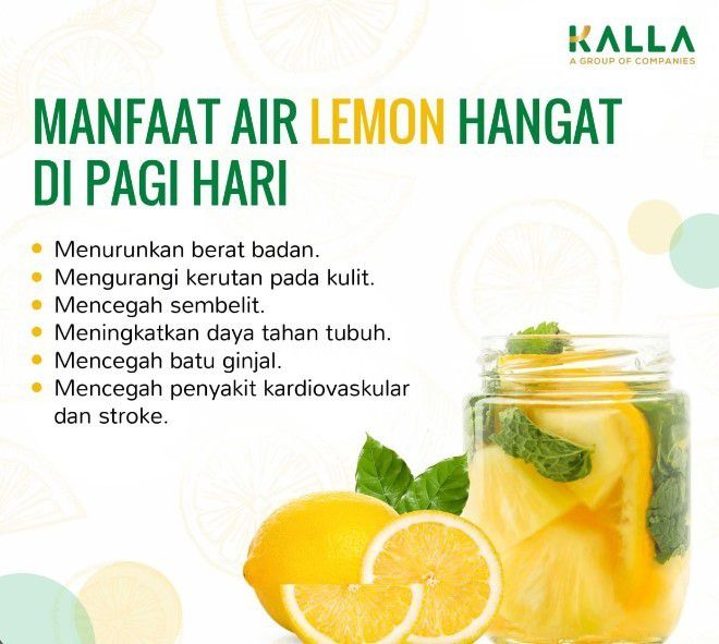 Banyak sumber mengklaim bahwa air lemon buatan sendiri memberikan manfaat kesehatan dan dapat membantu menurunkan berat badan. Jeruk lemon kaya akan asam sitrat, vitamin C, asam folat, vitamin B2, dan memiliki komponen antioksidan, antiradang, dan antiaging. Berikut manfaat lemon bagi kesehatan yang perlu kamu tahu
