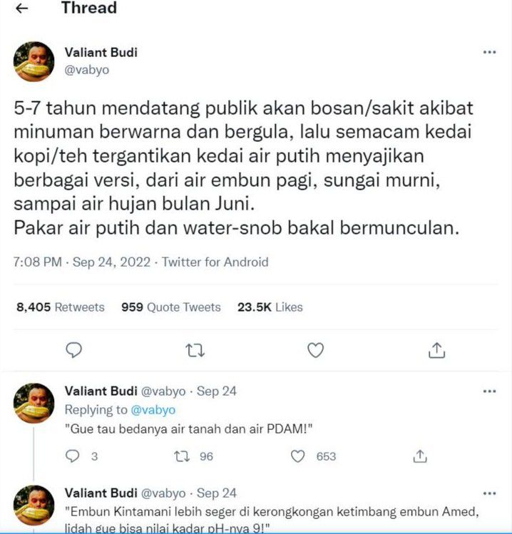 Seperti seorang warganet dengan nama akun @vabyo di Twitter, membahas soal air putih yang memiliki manfaat baik bagi tubuh. Tak disangka jika pembahasan ini menyebar hingga muncul segala jenis merek air putih yang diklaim punya rasa kurang enak.