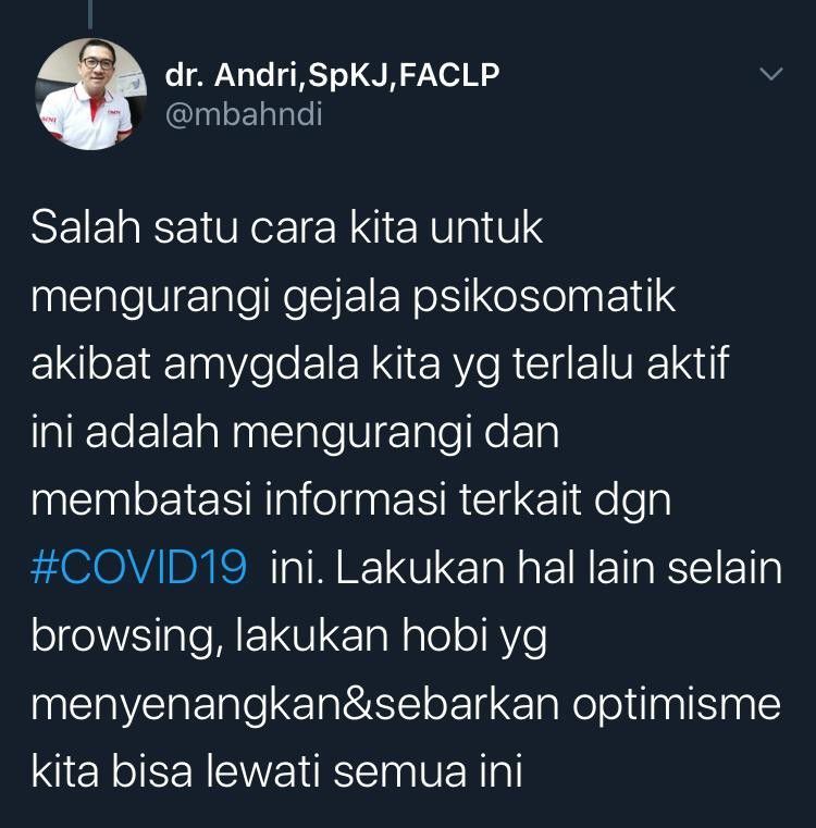 Lebih lanjut dr. Andri menjelaskan bahwa reaksi psikosomatik tubuh saat ini memang terasa. Salah satu yang bikin reaksi sakit itu muncul sebenarnya berasal dari kecemasan akibat berita mengenai COVID-19 yang terus menerus dikonsumsi masyarakat.