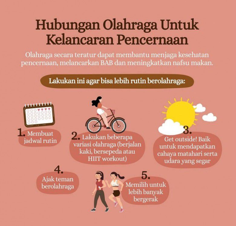 Pola olah raga yang teratur, disertai dengan pola pikir yang positif dan pola makan yang sehat dan tinggi serat, adalah landasan gaya hidup sehat. Olahraga bahkan dapat membantu mengatasi sembelit dan meningkatkan kesehatan pencernaan!