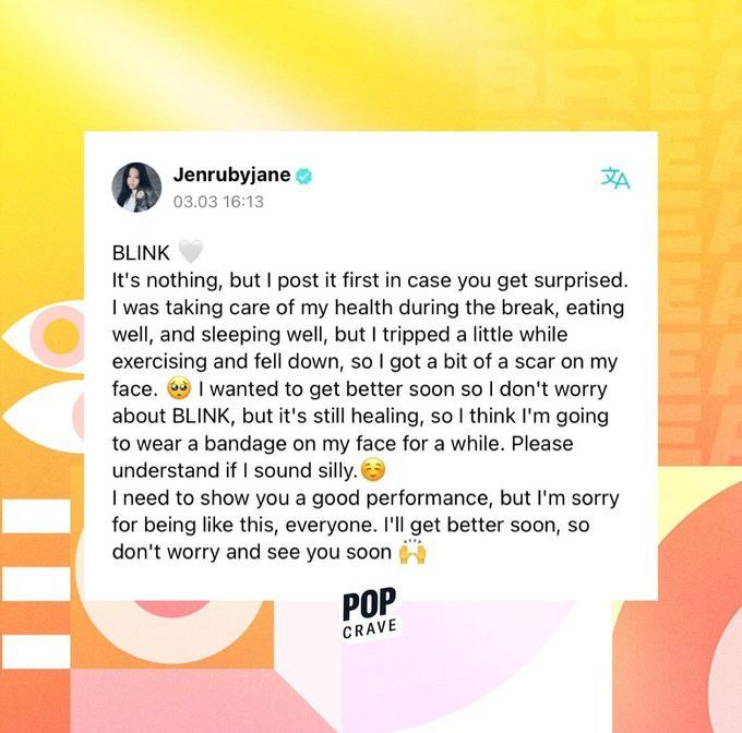 Jennie pun meyakinkan para penggemarnya bahwa kondisinya baik-baik saja dan akan segera kembali untuk memberikan penampilan terbaiknya. Ia juga menulis bahwa kini ia menerima pengobatan setiap hari agar bisa segera sembuh.
