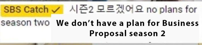 Namun, SBS baru-baru ini mengecewakan penggemar setelah memberikan jawaban soal isu Business Proposal musim 2 tersebut. Pihak SBS menuturkan bahwa season 2 Business Proposal tidak sedang berlangsung saat ini.