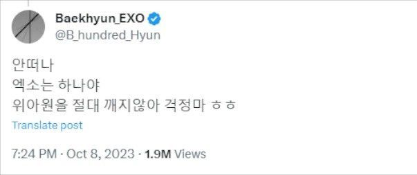 Ketika itu, ada seorang fans yang mempertanyakan apakah Baekhyun juga akan keluar dari grupnya. "Baekhyun-ah, apakah kamu akan meninggalkan EXO?" cuit seorang penggemar. Baekhyun rupanya melihat pertanyaan ini dan memberikan jawaban.