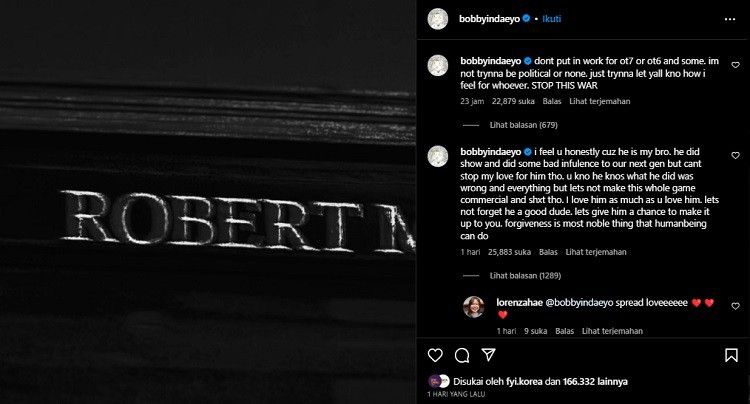 Namun, rapper bernama asli Kim Jiwon ini menyebut jika B.I sudah menyadari kesalahannya. Maka dari itu, dia mengajak para penggemar untuk memaafkan B.I. Bobby juga mengingatkan bahwa B.I aslinya orang baik dan pantas mendapat kesempatan untuk memperbaiki diri.
