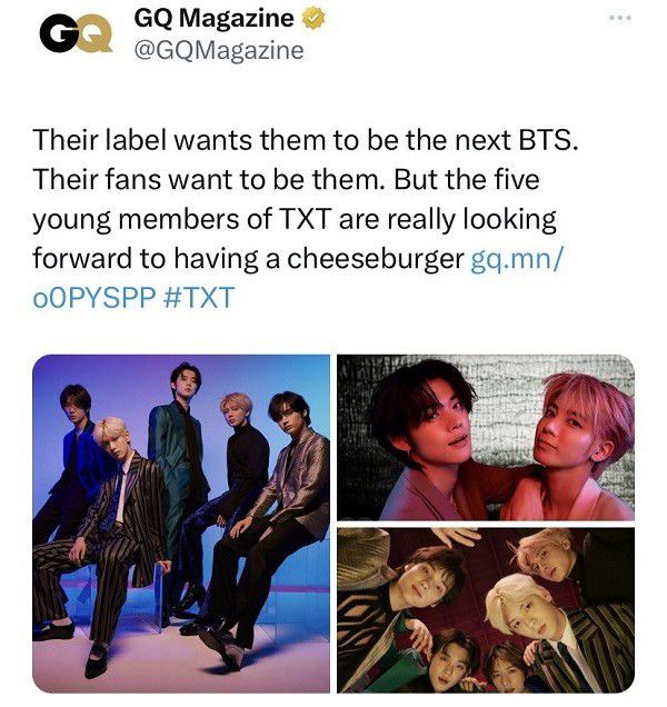 "Label mereka ingin mereka menjadi BTS selanjutnya. Penggemar mereka ingin menjadi mereka. Tapi kelima member muda TXT sangat menantikan untuk memiliki cheeseburger," cuit GQ Magazine di Twitter yang disambut protes dari para fans TXT.