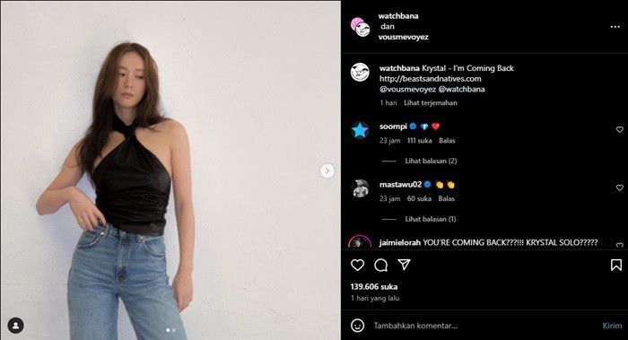 Kabar ini disampaikan idol bernama asli Jung Soo Jung itu dalam postingan di Instagramnya. Di unggahannya, Krystal Jung memajang foto cantiknya yang sedikit blur dengan mengenakan atasan hitam dan celana jeans.