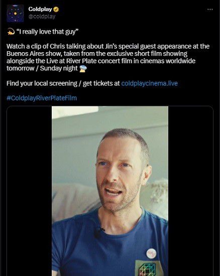 Terbaru, Chris Martin menyampaikan pernyataan menarik soal salah satu personil BTS yakni Jin. Pengakuan ini tampak dalam cuplikan wawancara yang tayang di akun Twitter Coldplay. Di situ, Chris mengaku sangat menyukai idol bernama asli Kim Seok Jin tersebut.