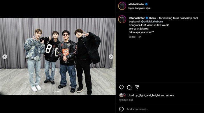 Dalam unggahan yang dibagikan pada Rabu, 3 Januari 2024, Atta Halilintar memakai setelan busana serba hitam berpose bersama Sangyeon, Jacob dan Kevin. Kakak Thariq Halilintar itu mengaku bertemu ketiganya saat mengunjungi basecamp THE BOYZ.