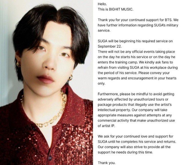 Sebagai informasi, sebelumnya diumumkan bahwa Suga akan menjalankan tugas sebagai pelayanan publik selama wamil. Jika dibandingkan dengan Jin dan J-Hope yang tengah bertugas sebagai tentara aktif, masa wamil Suga akan lebih panjang 3 bulan. Jadi, Suga BTS diperkirakan selesai wamil pada 21 Juni 2025.