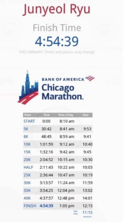 Catatan jarak tempuh dan finish time Ryu Joon Yeol (allkpop.com)
