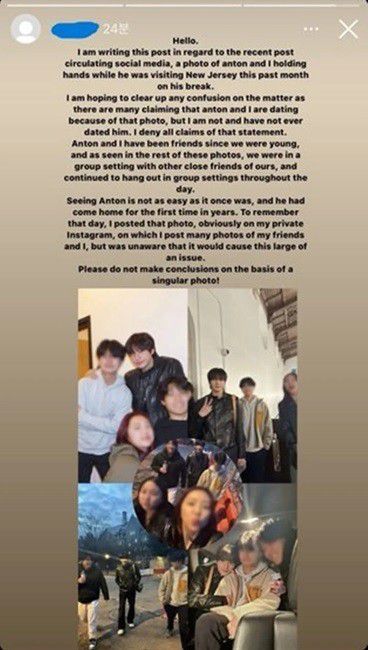 'A' mengungkapkan bahwa dia dan idol bernama asli Lee Chanyoung itu sudah berteman sejak kecil. Dia dan Anton pun tidak hanya berdua saat foto itu diambil, melainkan ada orang-orang lain. Ketika itu, mereka pergi bersama tidak hanya berduaan.