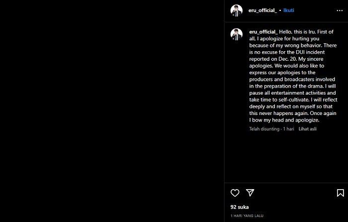 "Saya minta maaf karena telah membuat Anda khawatir karena perilaku saya yang salah. Tidak ada alasan untuk mengemudi dalam keadaan mabuk, dan saya dengan tulus meminta maaf dari lubuk hati saya," tulis Eru yang dilansir dari Allkpop.