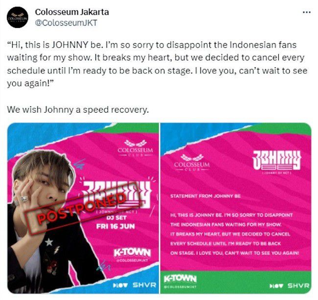"Hai, ini Johnny Be. Aku minta maaf telah mengecewakan fans Indonesia yang menantikan pertunjukanku. Ini membuatku sedih, tapi kami memutuskan untuk membatalkan semua jadwal sampai aku siap untuk kembali ke atas panggung. Aku cinta kalian, tidak sabar untuk bertemu kalian lagi!" tulis Johnny NCT.