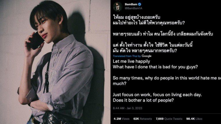 Menggunakan bahasa Thailand, BamBam GOT7 menuliskan ungkapan kekesalannya pada orang-orang yang melontarkan kebencian kepadanya. BamBam menanyakan alasan kebencian itu dan meminta mereka untuk membiarkannya bahagia.