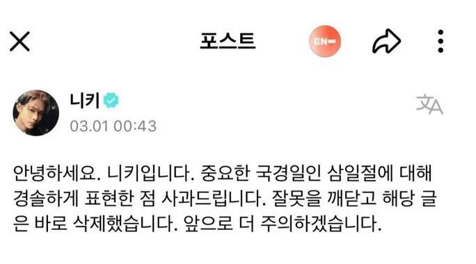 "Halo. Ini Ni-Ki. Aku mohon maaf atas sikap cerobohku terhadap Hari Gerakan Kemerdekaan 1 Maret, hari penting peringatan nasional. Aku menyadari kesalahanku dan segera menghapus postingan tersebut. Aku akan lebih berhati-hati di masa depan," ungkap Ni-Ki ENHYPEN.